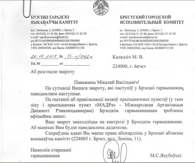 На днях ему пришел ответ за подписью зампредседателя Брестского горисполкома Николая Якубовского. В нем говорится, что местные власти сделали официальный запрос по поводу правильности названия остановки, и этот вопрос стоит у них на контроле.