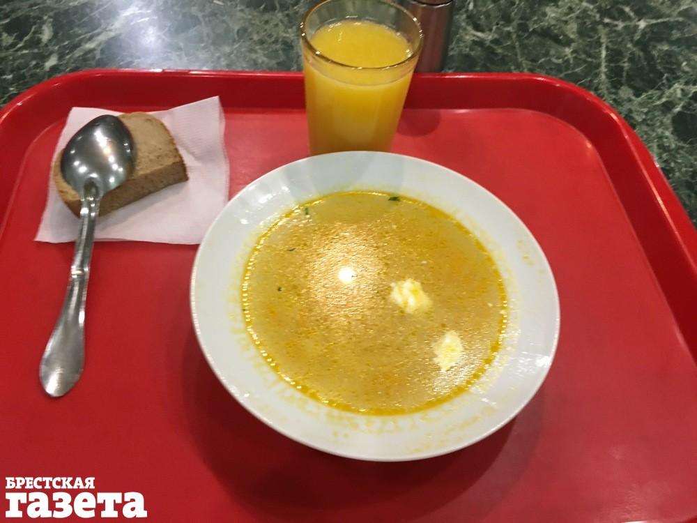 Чтобы строго следовать редакционному заданию, я заказала себе щи, кусочек хлеба и стакан апельсинового сока, чтобы завершить обед чем-то вкусненьким. Заказ оформили быстро: хлеб положили на салфеточку, ложку на хлеб и поставили все на чистый поднос. Щи были теплыми, но немного пресными — то ли соли не хватило, то ли сказывалось отсутствие мяса. Обошелся мой скромный обед в один рубль и две копейки.