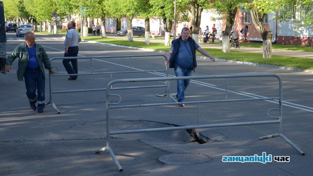 Асфальт провалился на главной улице в Ганцевичах – Октябрьской – вечером 31 мая. Произошло это буквально в пару сотнях метров от площади. На месте провала на проезжей части поставили металлическое ограждение, так как яма серьезная, сообщает ganc-chas.by.