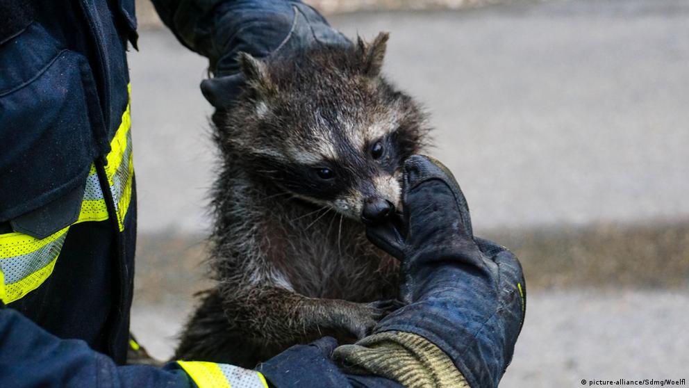 Енот на фото попал в новостные ленты после того, как пожарные города Гёппингена на юге Германии достали его из дымовой трубы камина. Чтобы помочь животному, они использовали трос, к которому был прикреплен щит — с его помощью им удалось протолкнуть пленника в подвал, в объятия поджидающих спасателей.