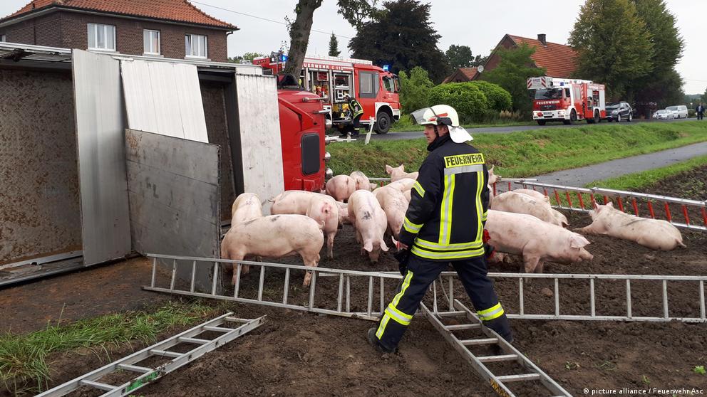 В окрестностях города Ашеберга водитель грузовика, перевозившего 135 свиней, не справился с управлением и съехал в кювет. Грузовик перевернулся, пять свиней погибли сразу, еще пять получили смертельные травмы и их пришлось усыпить. За оставшимися в живых 125 свиньями присматривала, а потом загружала их в кузов другого автомобиля бригада пожарных.