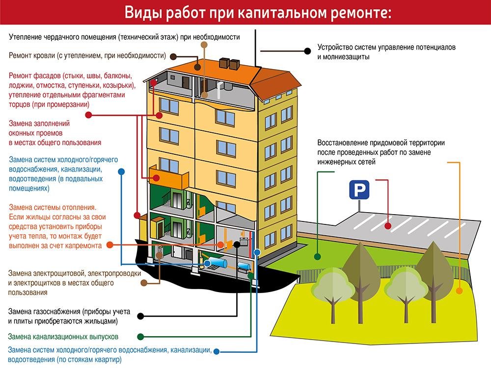 Все виды работ, которые будут выполнять в рамках капитального ремонта за счет средств местных бюджетов и отчислений граждан, определяются проектом на ремонт конкретного дома. Документ разрабатывается с учетом обследования в рамках перечня работ, относящихся к жилому дому. В проект не могут быть включены такие работы, как замена и ремонт сетей и сооружений, которые находятся в хозяйственном ведении других организаций (радио, телефон, телевидение, наружные сети электро-, тепло-, газо- и водоснабжения, водоотведения, трансформаторные подстанции, центральные тепловые пункты). За свой счет собственники должны заменить внутриквартирное, газовое и сантехническое оборудование, не включая системы отопления, противодымной защиты и автоматической пожарной сигнализации.